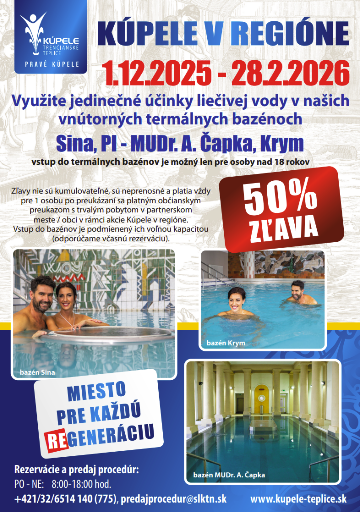 Kúpele Trenčianske Teplice ponúkajú pre občanov, ktorí majú trvalý pobyt v našej obci zľavu vo výške 50% na vstup do termálnych bazénov Sina, PI - MUDr. A. Čapka a Krym v Trenčianskych Tepliciach, v termíne od 1.12.2025 do 28.2.2026.